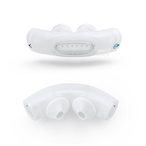 Ultra-soft silicone nasal pillows — designed for a gentle, secure seal with minimal irritation at the nostrils.